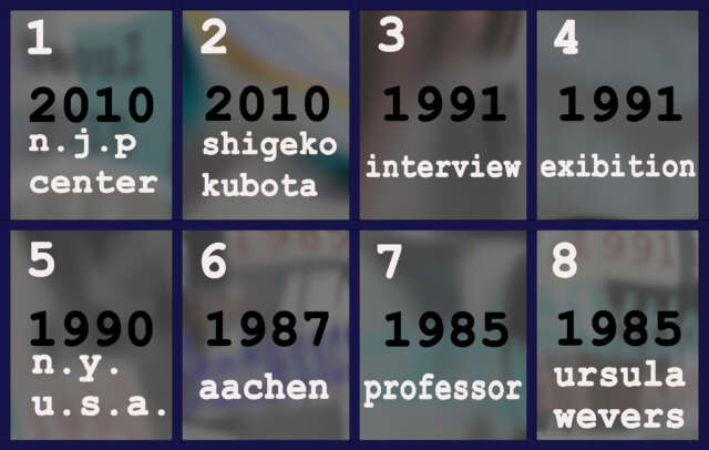 01- "Nam June Paik Art Center" , 2010, Video - Dok.,Ton,7:40 Min., Suvon-Seoul, Südkorea02- "Shigeko Kubata", 2010, Video - Dok., Ton, 5:05 Min., Gwangju, Südkorea03- "Interview", 1991, Video - Dok., Ton, 21:46 Min., "Bilka Forum", Düsseldorf, Deuschland04- "Ausstellung", 1991, Video - Dok.,Ton, 11:35 Min., Kunsthalle Düsseldorf, Deuschland05- "Discover EU-Video", 1990, Video - Dok., Ton. 12:24 Min., A.E.A. New York, USA06- "Aachen", 1987, Video - Dok., Ton, 3:15 Min., Neue Galerie/Sammlung Ludwig,, Aachen, Deutschland07- "Professor", 1985, Video - Dok.,Ton, 5:38 Min., Kunstakademi Düsseldorf, Deuschland08- "N.J.Paik.+U.Werves", 1985, Video-Dok., Ton, 6:45 Min., Kunstakademi Düsseldorf, Deuschland